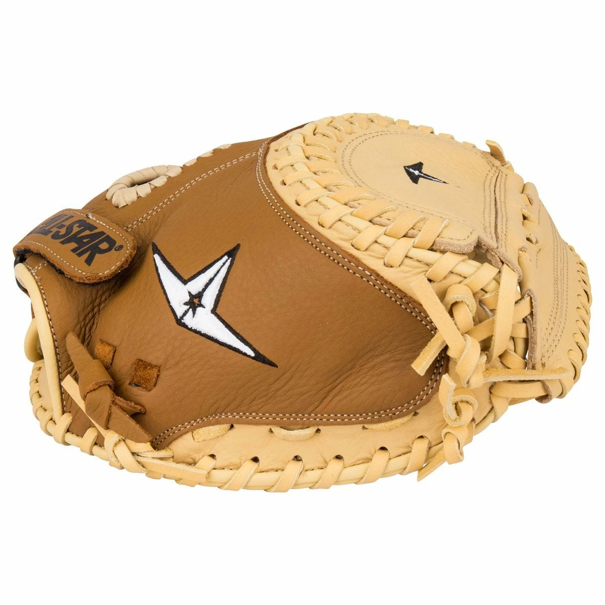 The All-Star Pro 33.5″ Youth Fastpitch Softball Catcher’s Mitt is intentionally designed for young fastpitch catchers with smaller hands. The 33.5 inch option of this model offers a longer version for younger players looking to prepare for travel and college ball. Constructed with full-grain cowhide, these mitts are softer out of the box allowing for a faster break-in time. The closed back and Velcro strap give players plenty of flexibility in creating a custom and secure fit.