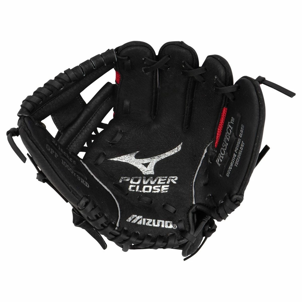 The Mizuno Prospect Series PowerClose GPP1000Y3RD 10-inch Youth Baseball Glove is constructed with a Full Grain Leather Palm/Pigskin back and ButterSoft Palm Liner for increased durability, feel and comfort. The use of a MZO lining disperses perspiration away from the skin and the AirMesh glove back increases flexibility and breathability for a very comfortable fit. Measured at 10-inches, this glove is perfectly sized for infielders trying to learn the game.