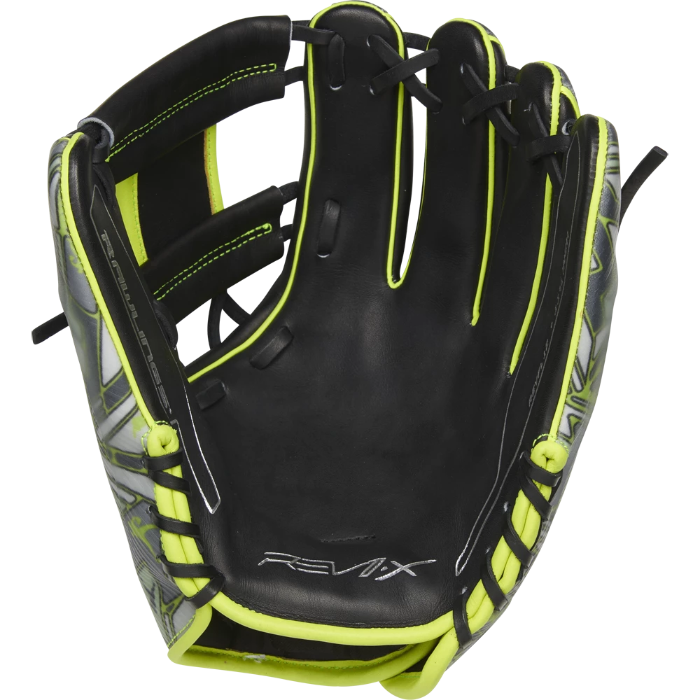 In addition, we’ve crafted our REV1X series gloves with a multi-layer back too. Each model even has its own molded, 3D-sublimated design.The 11.75-Inch REV1X glove is equipped with a stylish, eye-catching neon green and black design that is sure to turn heads on the field. The revolutionary lace-less I-web and heel will also help you stand out. This innovative new feature allows you to have a completely consistent feel, to make sure you’re snagging everything hit your way. And with the ultra-premium ‘HOH’ leather in all the right places, these REV1X gloves boast the same professional quality break-in & performance you expect from Rawlings.