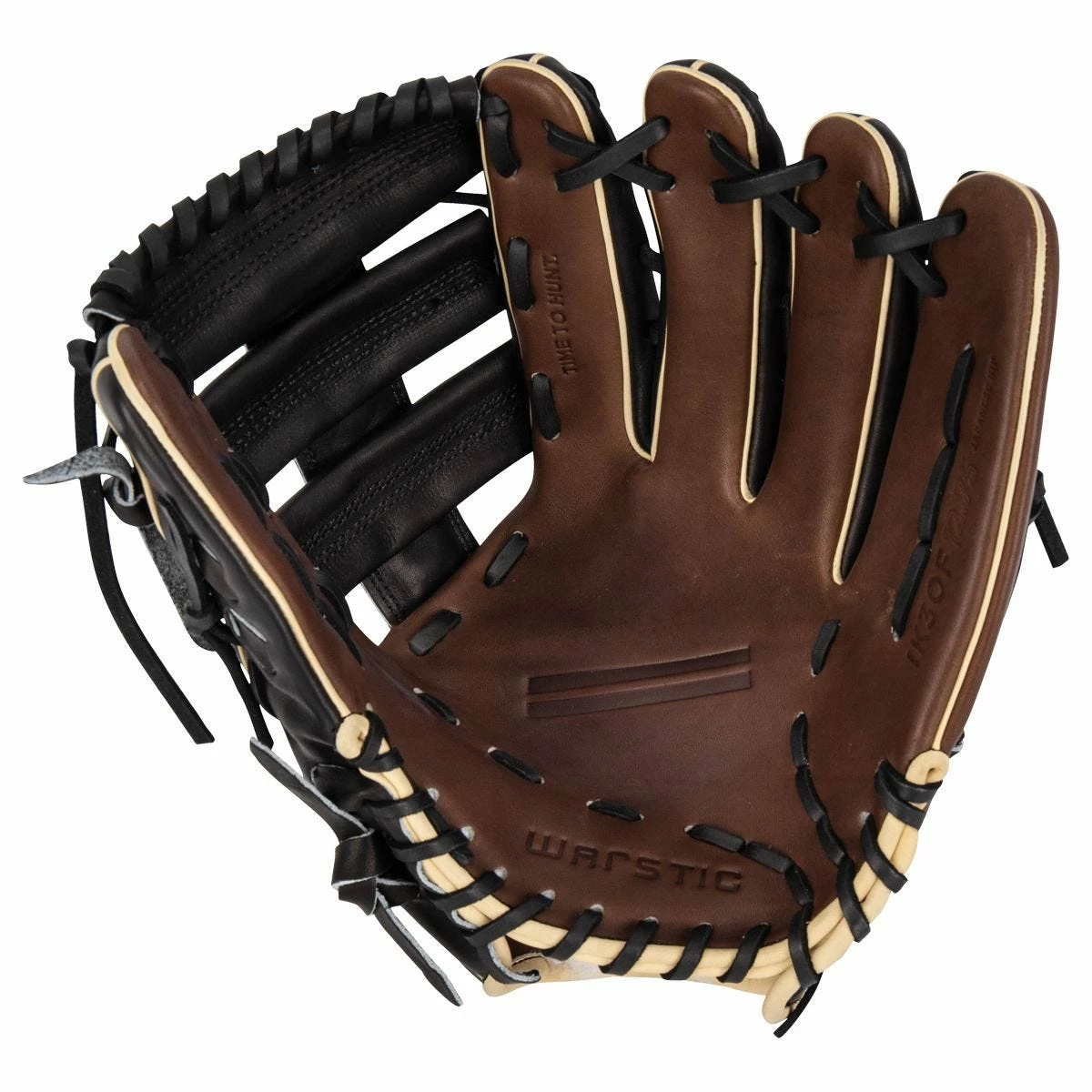 Warstic’s Bison color scheme incorporates black leather on the backhand, combined with chocolate brown leather on the pinky edge, palm and liner, and cream leather edging with black laces. Accentuated with gold Warstripes on the wrist strap and Warstic embroidered in gold on the backhand, this glove is sure to turn heads as well as double plays. This glove will also include “It’s not the weapon, it’s the warrior” embossed in the leather, and “Time To Hunt” on the index finger.